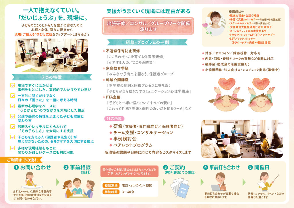 子ども子育て支援現場の皆様へ。パンフレット郵送サービス始めました。 【A4三つ折りのパンフレット】が出来ました。 以下のパンフレットの郵送サービスも行なっていきたいと思います。 『施設内で検討したい、園長会で配布したい、自治体で検討したい、地域で配布したい』などのご希望がある場合は、ご住所と希望理由や部数、いつまでに届けばよいか等のご要望を添えてご連絡ください。 ニーズに合わせてお届けいたします。 こちらのページからも見られます。 講師依頼について